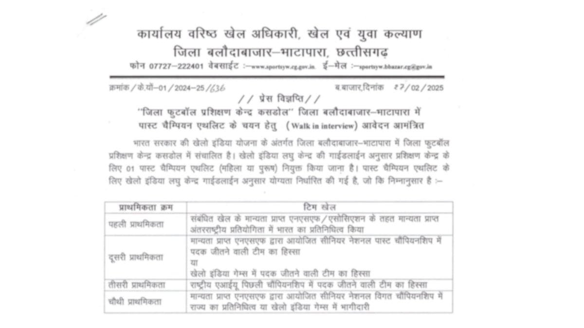 “जिला फुटबॉल प्रशिक्षण केन्द्र कसडोल” जिला बलौदाबाजार-भाटापारा में पास्ट चैम्पियन एथलिट के चयन हेतु (Walk in interview) आवेदन आमंत्रितभारत सरकार … Read more